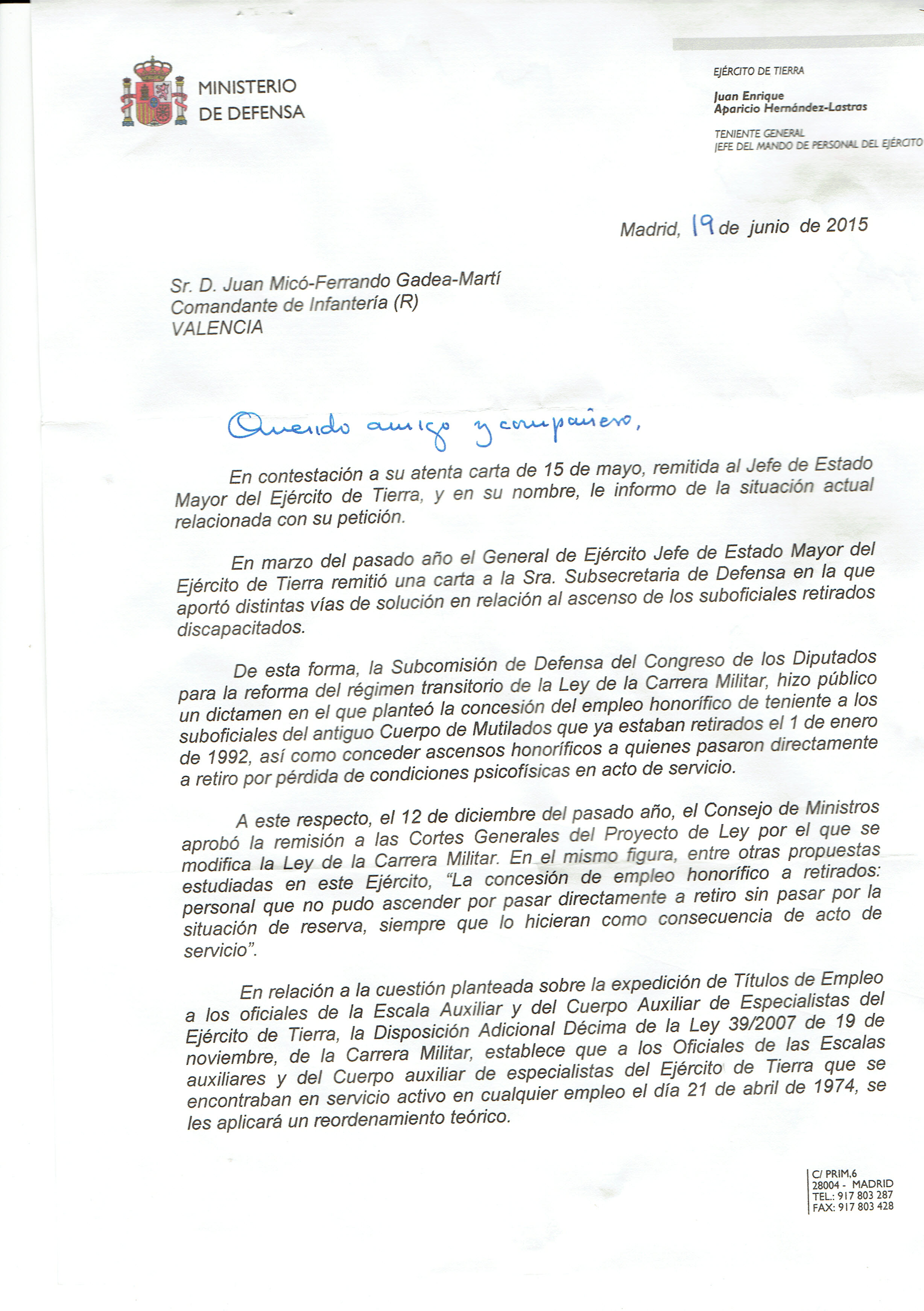 Os enviamos una copia de los dos últimos Escritos enviados por este Colectivo de Esposas al Excmo. Sr. General Director del Mando de Personal ( Tte. Gral. Hernández Lastras ), referente a la solución a dar a los Suboficiales Retirados por pérdida de facultades Psicofísicas acahecidas como consecuencia de haber sufrido un accidente ene Acto de Servicio o Patología Grave Invalidante, por si teneis a insertarlas en la página WEBB, para conocimiento de aquellos compañeros a los que pueda interesar, significándo que cuando se produzca otra comunicación de la Dirección del citado mando de Personal os la haremos llegar.