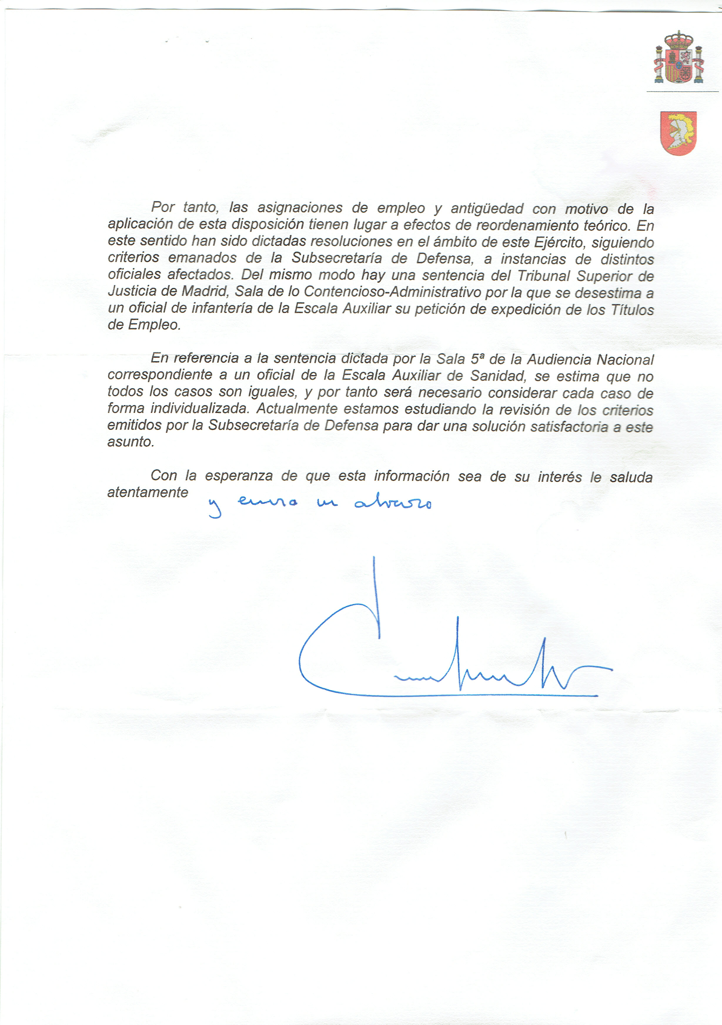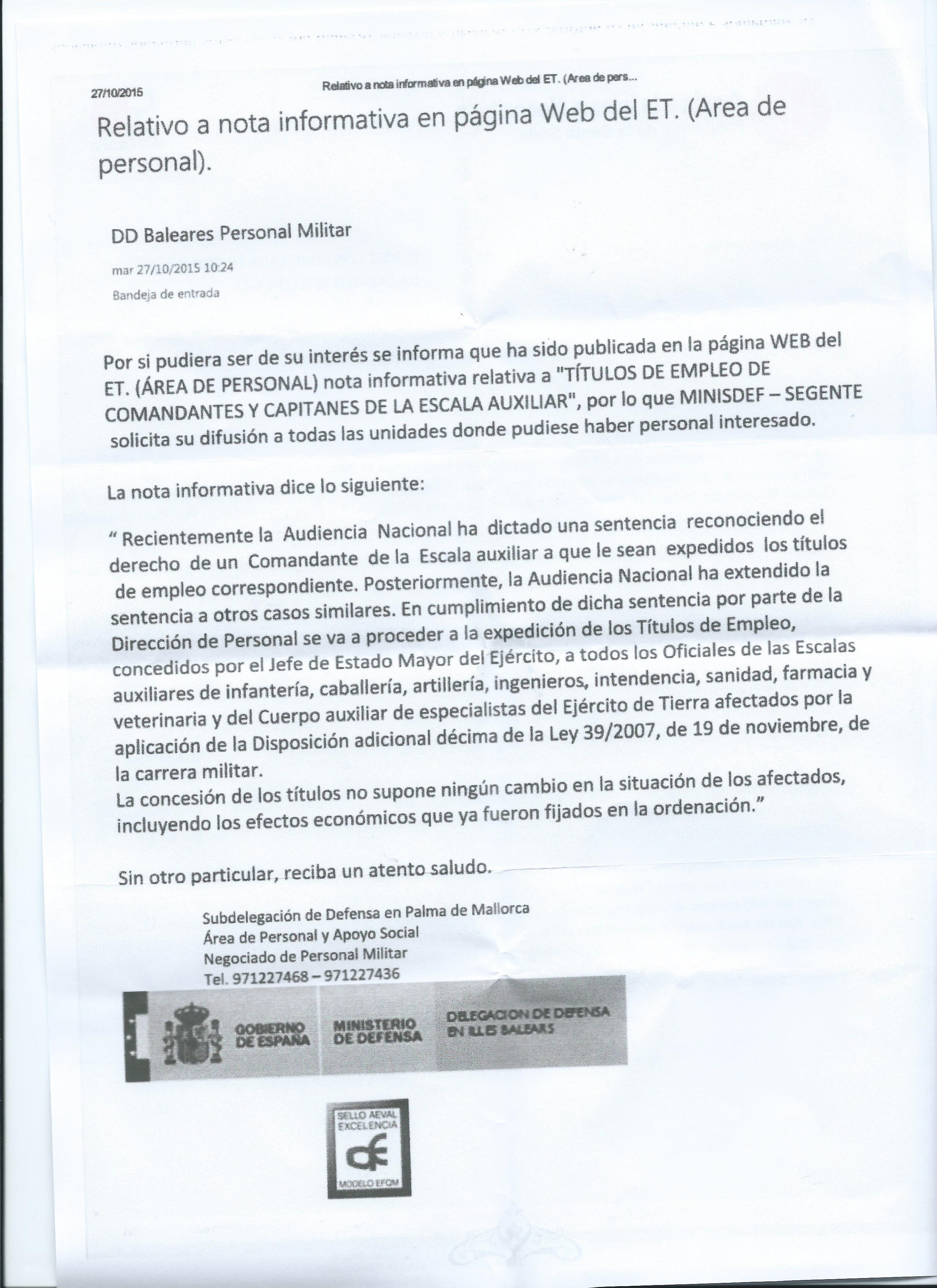 " Recientemente la Audiencia nacional, ha dictado una Sentencia reconociendo el derecho de un Comandante de la Escala Auxiliar a que le sean expedidos los títulos de empleo correspondiente. Posteriormente, la Audiencia nacional ha extendido la sentencia a otros casos similares. En cumplimiento de dicha sentencia por parte de la Dirección de Personal se va ha proceder a la expedición de los Títulos de Empleo, concedidos por el Jefe de Estado Mayor del Ejército, a todos los Oficiales de las Escalas Auxiliares de Infantería, Caballería, Artillería, Ingenieros, Intendencia, Sanidad, Farmacia, Veterinaria y del Cuerpo de Especialistas del Ejército de Tierra afectados por la aplicación de la Disposición Adicional décima de la Ley 39/2007 de la carrera militar.