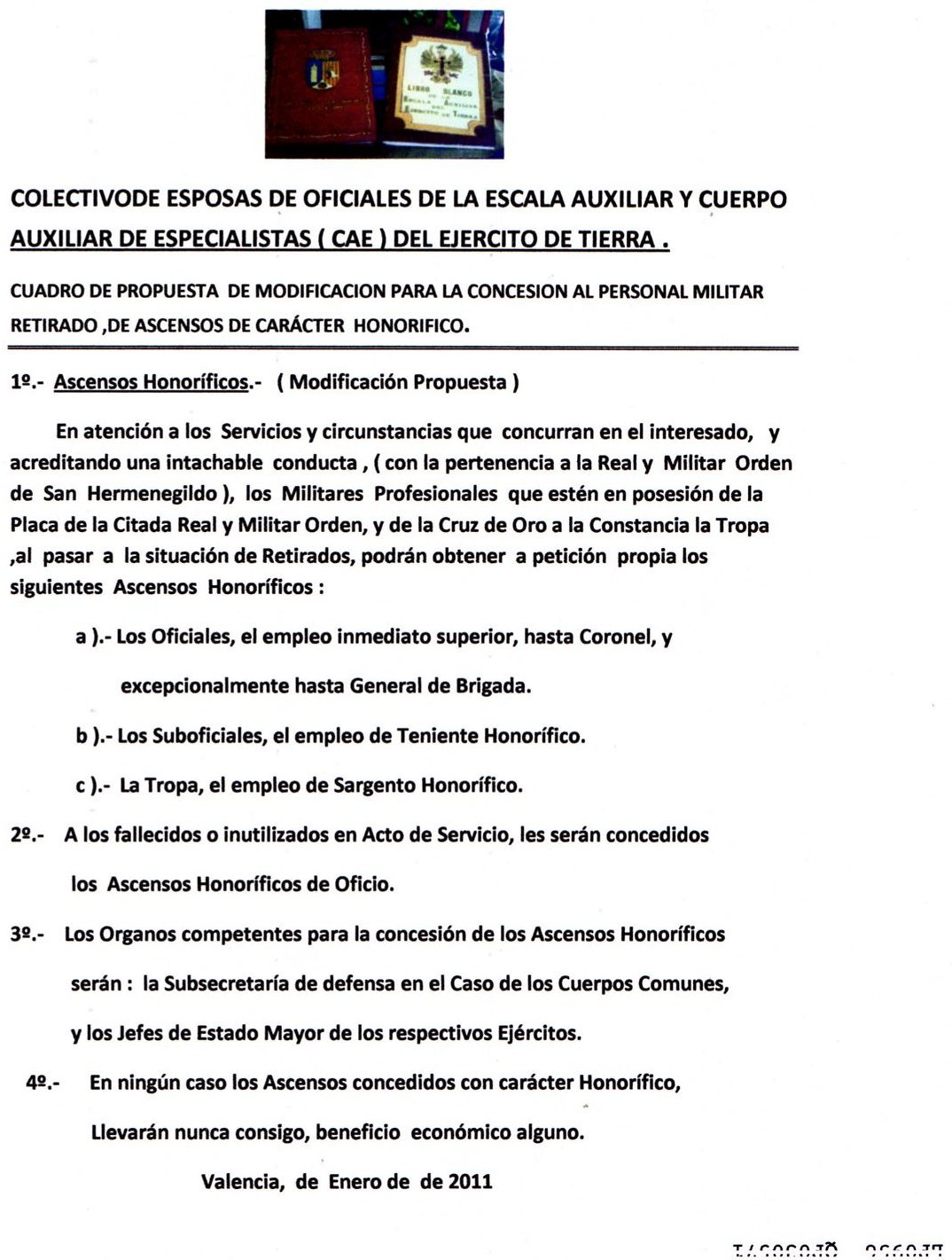 - Asi mismo, le enviamos también copia de la Propuesta de Modificación elaborada por este Colectivo de Esposas y que también fue con anterioridad remitida en diversas ocasiones, para ser estudiada y tenida en cuenta (al parecer sin ningún éxito) y de la que se presentó en la Comisión de Defensa una Propuesta por varios Grupos Parlamentarios y que finalmente salió aprobada una modificación que nos parece totalmente ARBITRARIA y DISCRIMINATORIA para la casi totalidad del Personal Militar, puesto que solamente acoge descaradamente a aquellos Comandantes y Tenientes Coroneles (Heridos en Acto de Servicio, o por pasar a Retiro) únicamente procedentes de la AGM, discriminando abiertamente a todo el resto de Oficiales de las demás Escalas del Ejército ., al detallar como condición : QUE HUBIERAN SERVIDO EN UNA ESCALA EN LA QUE EXISTA EL EMPLEO DE CORONEL, ya que en las demás Escalas no existe dicho empleo, lo que nos parece totalmente indigno y fuera de lugar, y que atenta abiertamente contra el derecho de igualdad que debe imperar en dicho Estamento, debiendo de ser irrelevante la Escala en la que se hubiese prestado Servicio y el empleo obtenido, puesto que su concesión debe obedecer a un sentimiento de fidelidad , profesionalidad ,e intachable conducta demostrada a lo largo de su carrera, con la posesión de la Placa de la Real y Militar Orden de San Hermenegíldo para el personal militar profesional, y de la Cruz de Oro a la Constancia para la Tropa, pudiendo ser solicitado por el interesado a petición propia al pasar a la situación de Retirado, como siempre antes venía ocurriendo.