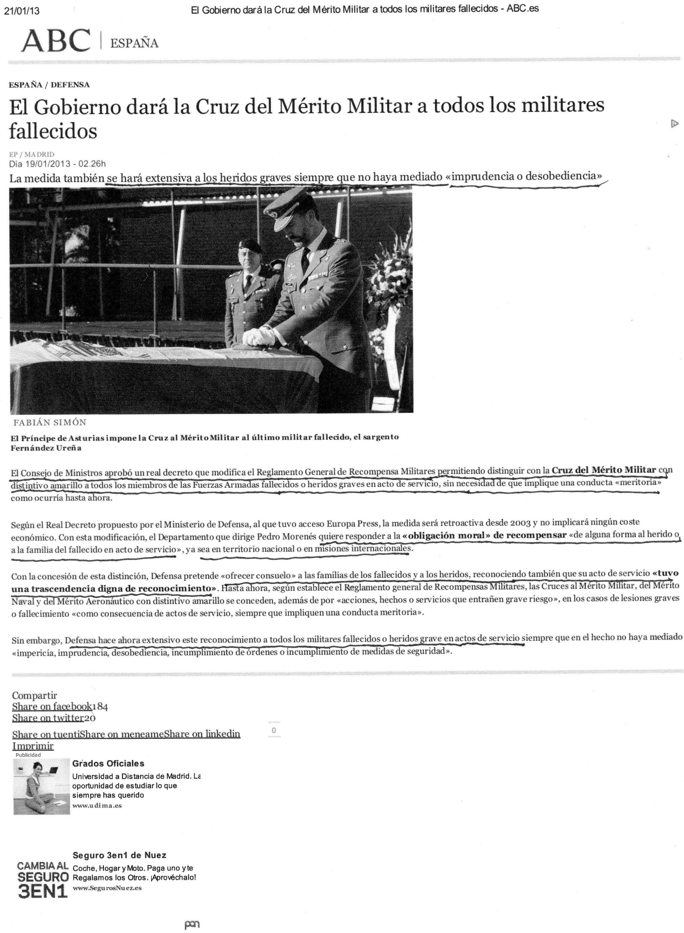 - En su momento por justicia y equidad, fué modificada la Normativa existente para la concesión de la CRUZ DEL MERITO MILITAR CON DISTINTIVO AMARILLO, con la finalidad de que esta Recompensa pudiese ser concedida a todos aquellos Militares que hubieran pasado a Retiro como consecuencia de haber resultado HERIDO EN ACTO DE SERVICIO, y la igualdad pudiese alcanzar a todos, como creemos que debe ser, pero fué introducida en el RD. 20/2013 de 18 de Enero, una NEFASTA y CRUEL "CLAUSULA DE RETROACTIVIDAD" que cercena de una forma totalmente arbitraria y discriminatoria, el derecho de acceso a la citada Recompensa, ya que solamente estipula que tengan derecho a la misma ,aquellos Militares que hubieran resultado fallecidos o heridos graves en Acto de Servicio a partir de la entrada en vigor del RD1040/2003, dejando fuera, apartados, a aquellos otros que incluso habiendo sufrido accidentes en Acto de Servicio, (quizás con heridas mucho mas graves), lo hubieran sido en fechas anteriores, lo que nos parece de todo punto ARBITRARIO, DISCRIMINATORIO Y CRUEL, tanto desde el punto de vista profesional como moral y ético. Por ello le rogamos que se interese y realice las gestiones necesarias para que se pueda dar una solución digna y justa a este GRAVE PROBLEMA DE DISCRIMINACION , procediéndose a ELIMINAR DEL RD 1040/2003 .DE RECOMPENSAS MILITARES ,LA CITADA NORMA DE RETROACTIVIDAD QUE LIMITA LA FECHA LA FECHA DE SU CONCESIÓN, en su " Disposición Derogatoria Única ", y quede sin mencionar ninguna fecha, con la finalidad de que todos aquellos militares que hubieran resultado heridos en Acto de Servicio, tengan el mismo derecho para poder acceder a obtener la concesión de dicha recompensa siendo que en algunos casos si se han concedido recompensas de otras clases, sin tener en cuenta fecha ninguna y con bastantes años de retraso.