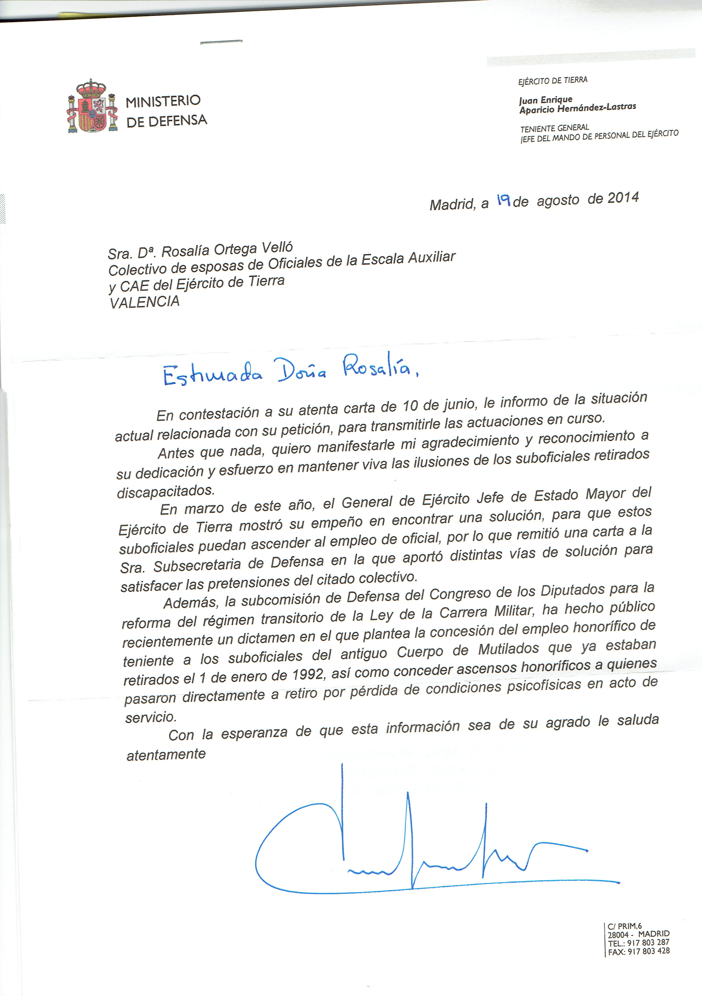 En este correo os enviamos una copia para conocimiento, del último escrito dirigido por este Colectivo de Esposas de Oficiales de la Escala Auxiliar y CAE del Ejército de Tierra al Excmo. Sr. TG. Jefe del Mando de Personal, y Excma. Sra. Subsecretaria de Defensa, sobre reconocimiento y ascensos que correspondan ,del Personal de Suboficiales Discapacitados Retirados por perdida de facultades Psicofisicas, acahecida por accidente sufrido en Acto de Servicio o Patología Grave Invalidante, a ver si en esta ocasión conseguimos que sean tenidos en cuenta y se les otorguen los derechos que en justicia les corresponden, en igualdad al resto de compañeros de Promoción.